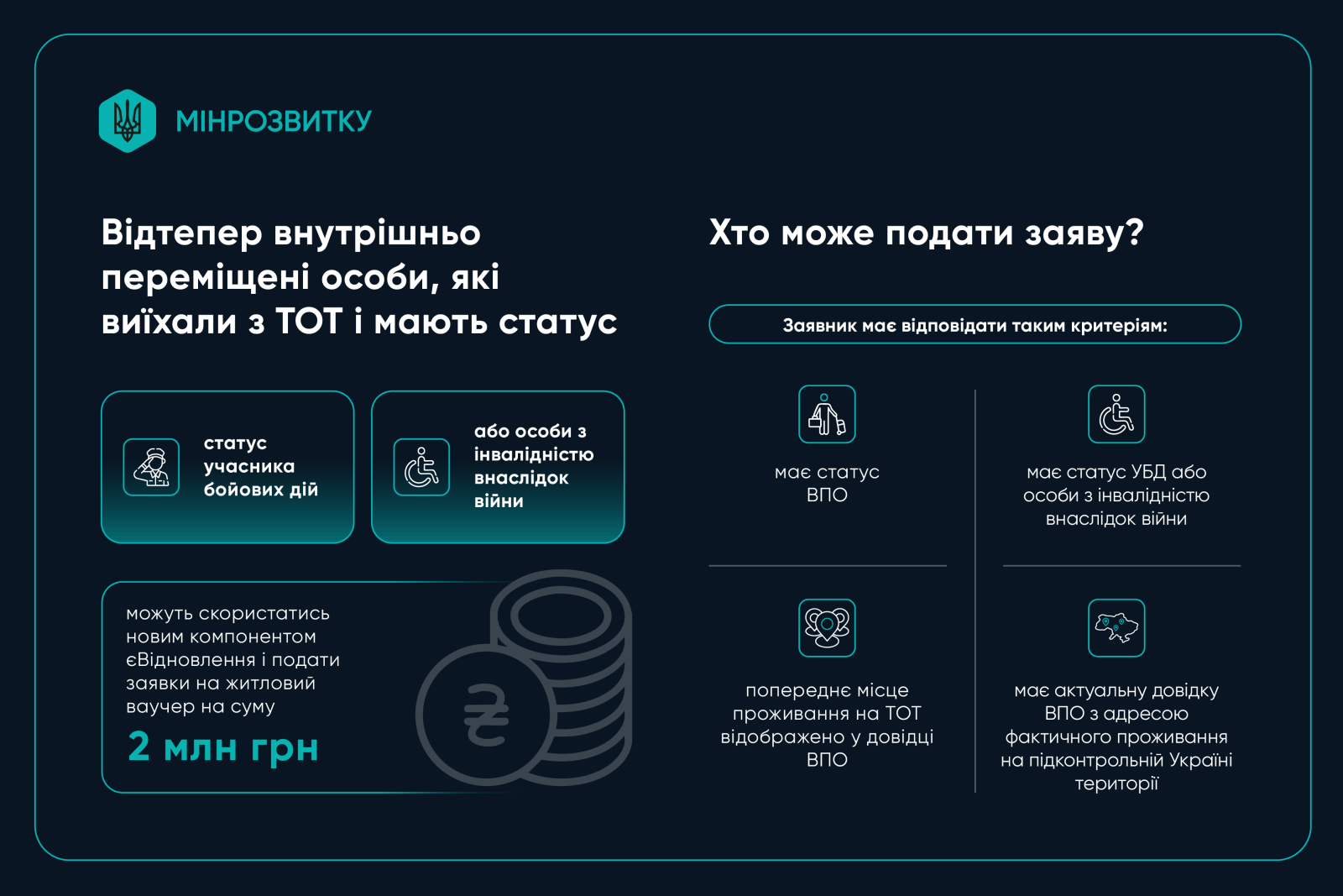 Відсьогодні, 1 грудня, внутрішньо переміщені особи, які виїхали з тимчасово окупованих територій і мають статус учасника бойових дій або особи з інвалідністю внаслідок війни, можуть скористатись новим компонентом єВідновлення і подати заявки на житловий ваучер номіналом 2 млн грн.