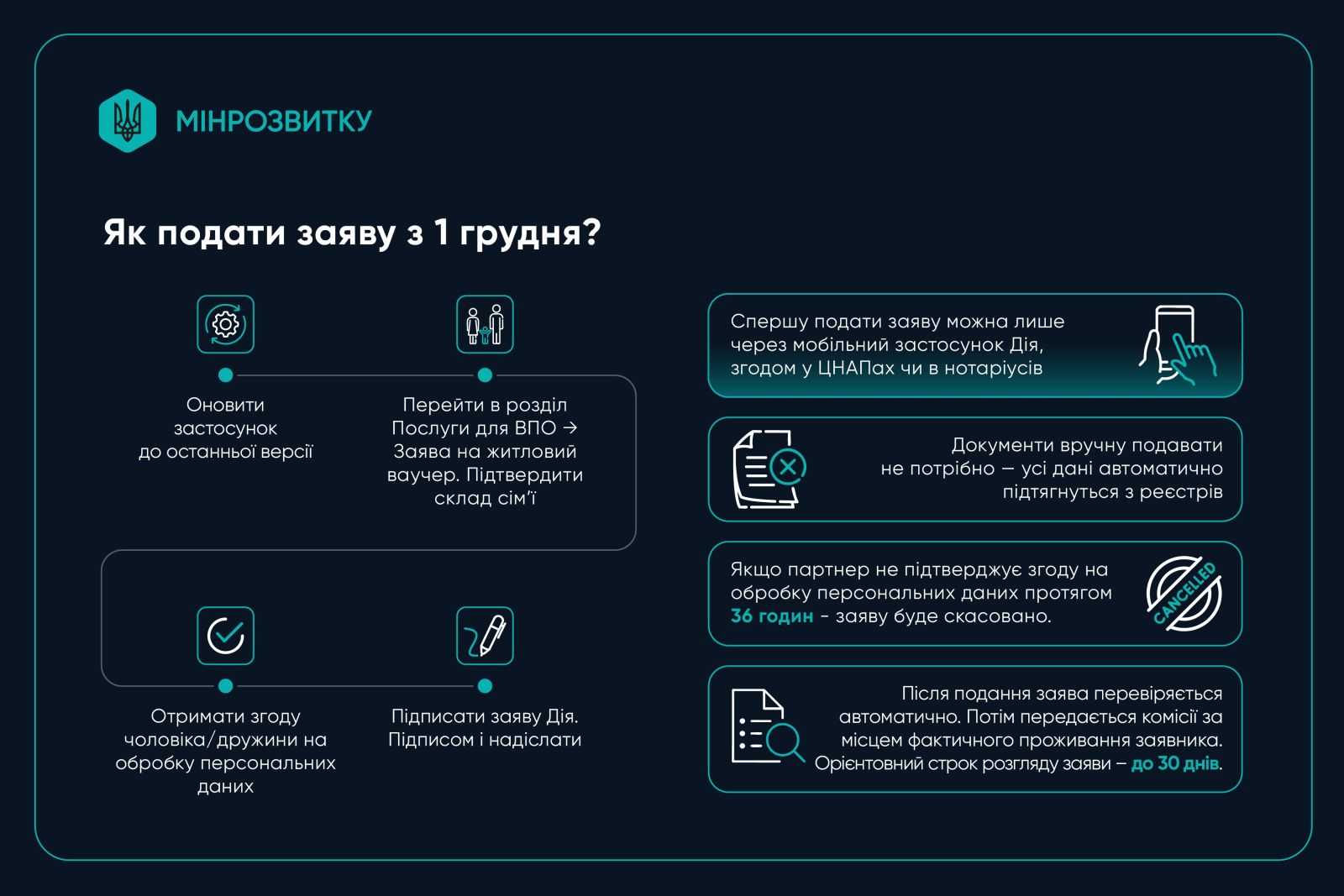 - Отримати згоду чоловіка/дружини на обробку персональних даних (через Дія.Підпис). Якщо партнер не підтверджує згоду протягом 36 годин - заяву буде скасовано)