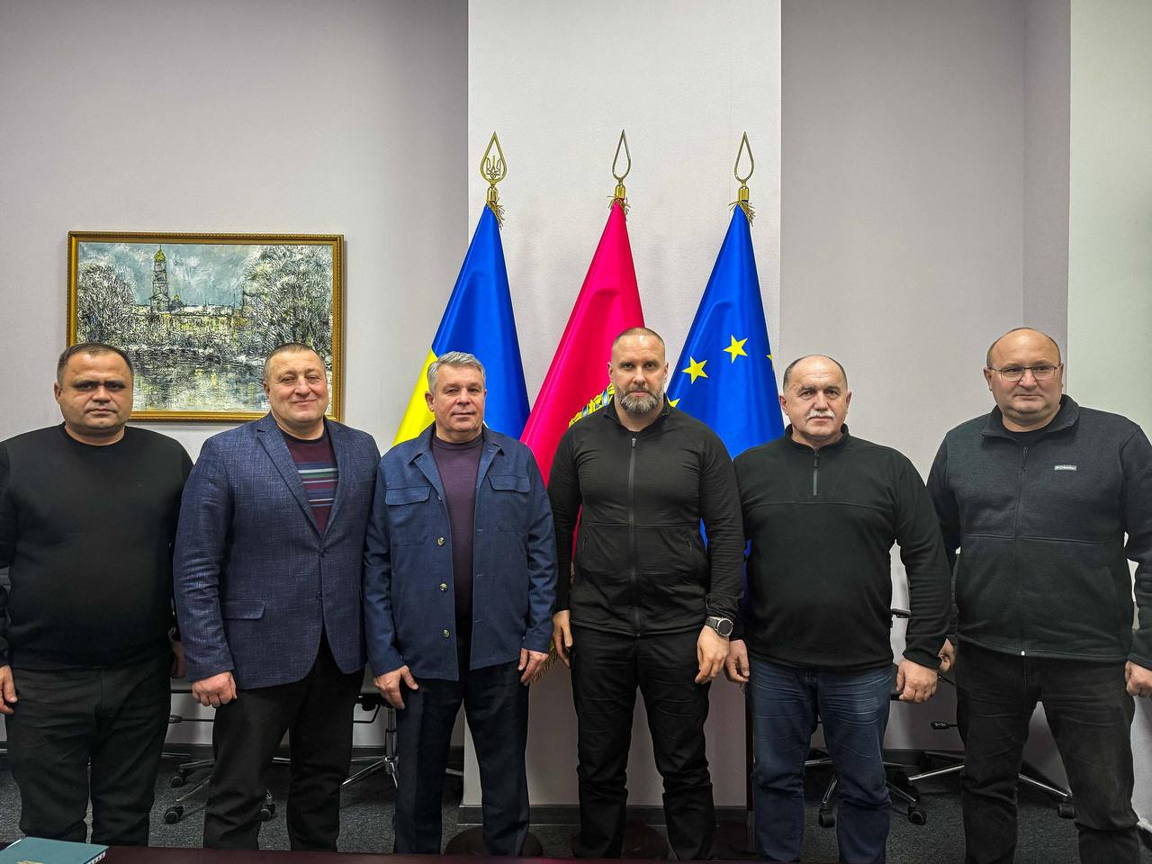 До зустрічі під головуванням начальника ХОВА Олега Синєгубова долучилися очільник Золочівської селищної військової адміністрації Харківської області Віктор Коваленко, голова Золочівської міської ради Львівської області Ігор Гриньков, голова Любешівської селищної ради Волинської області Олег Кух, а також їхні заступники. Учасники обговорили підсумки спільної роботи за 2025 рік.