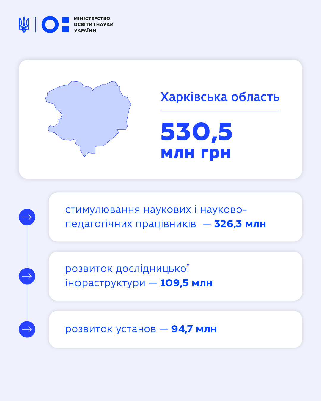 Одним із найбільших отримувачів фінансування є Харківська область — 530,5 млн грн. Регіон традиційно є одним із провідних наукових центрів України, де зосереджена значна кількість університетів і наукових установ.