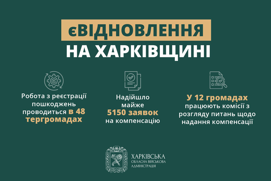 Зокрема, надійшло майже 5150 заявок на компенсацію. Нині в 12 громадах Харківської області створені та функціонують комісії з розгляду питань щодо надання компенсації за пошкоджені об’єкти нерухомого майна.
