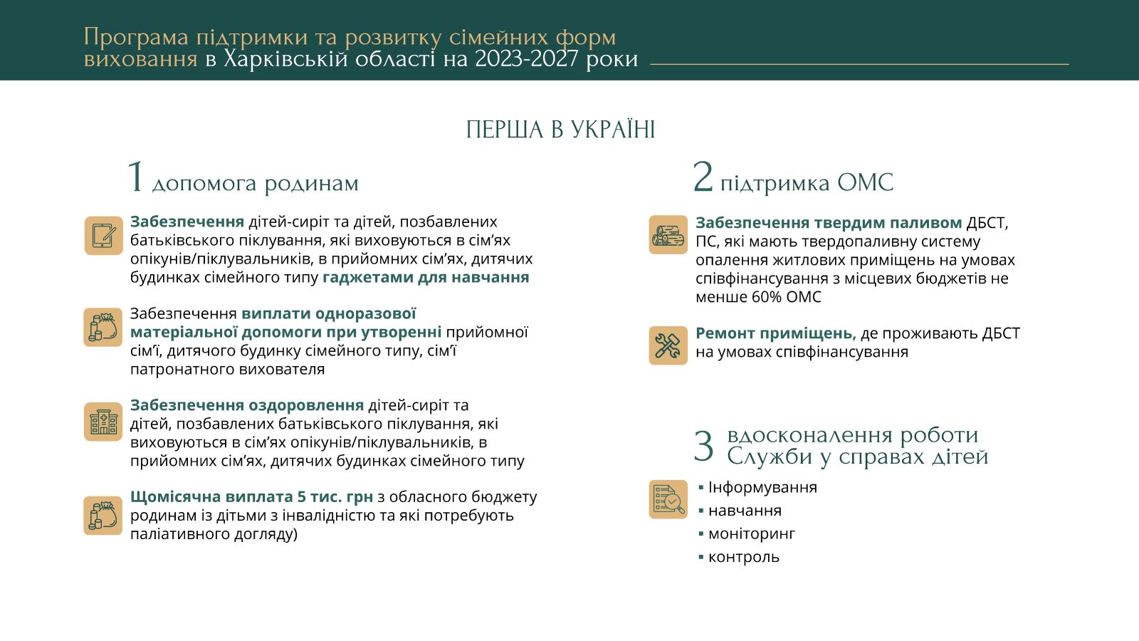 Допомога родинам передбачає одноразові матеріальні виплати при утворенні прийомної сім’ї, дитячого будинку сімейного типу, сім’ї патронатного вихователя; оздоровлення дітей-сиріт та дітей, позбавлених батьківського піклування; забезпечення дітей гаджетами для навчання.